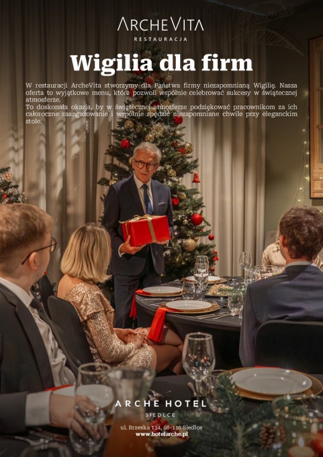 Święta Bożego Narodzenia to wyjątkowy czas – pełen bliskości, wdzięczności i refleksji. To idealna okazja, by wspólnie z zespołem podsumować rok, docenić współpracowników i zatrzymać się choć na chwilę – w ciepłej, życzliwej atmosferze. Zapraszamy do organizacji Wigilii Firmowych w Arche Hotel Siedlce, gdzie nowoczesność łączy się z lokalną historią i sercem do ludzi.
